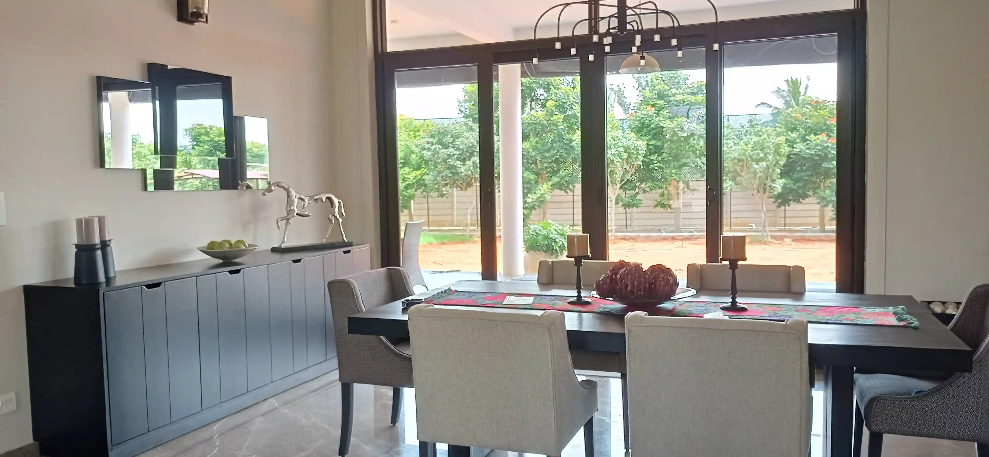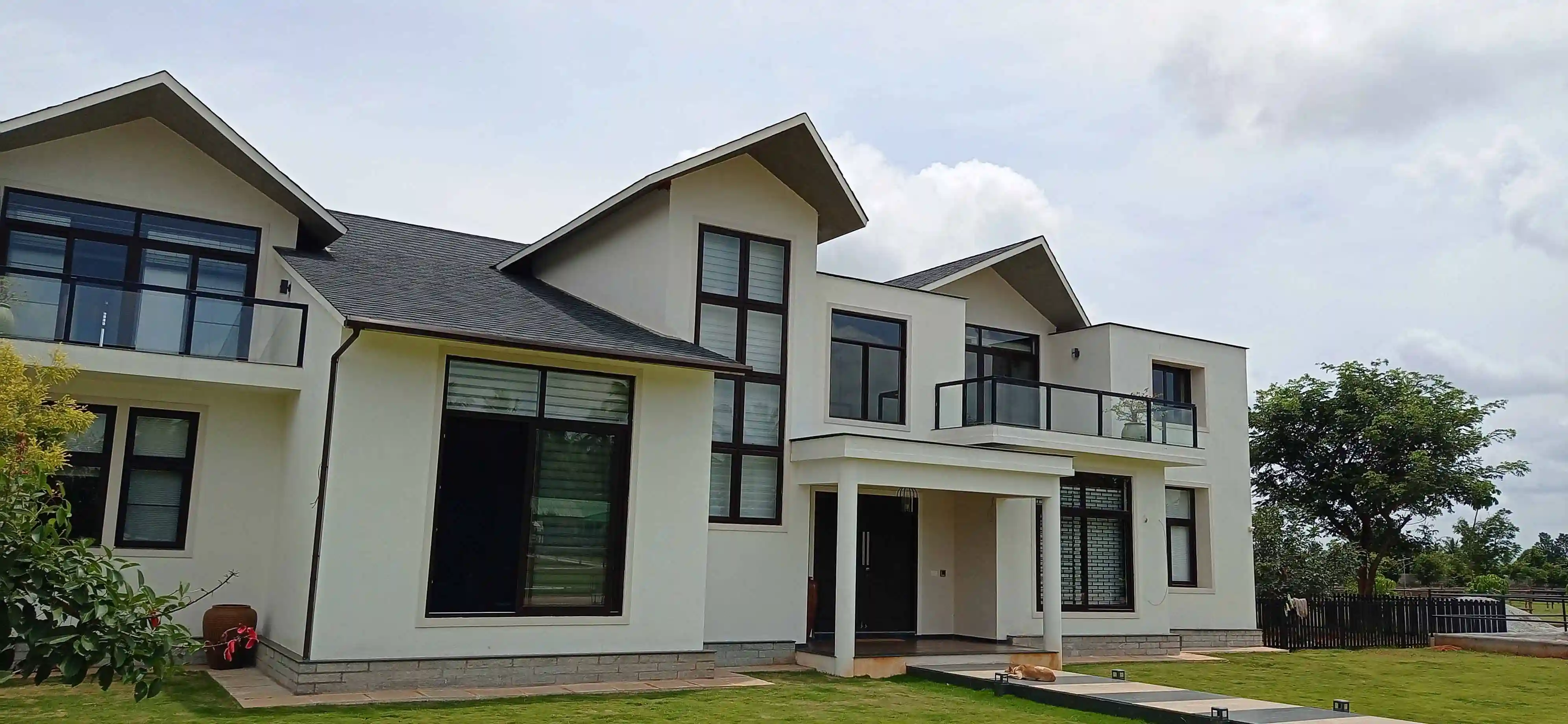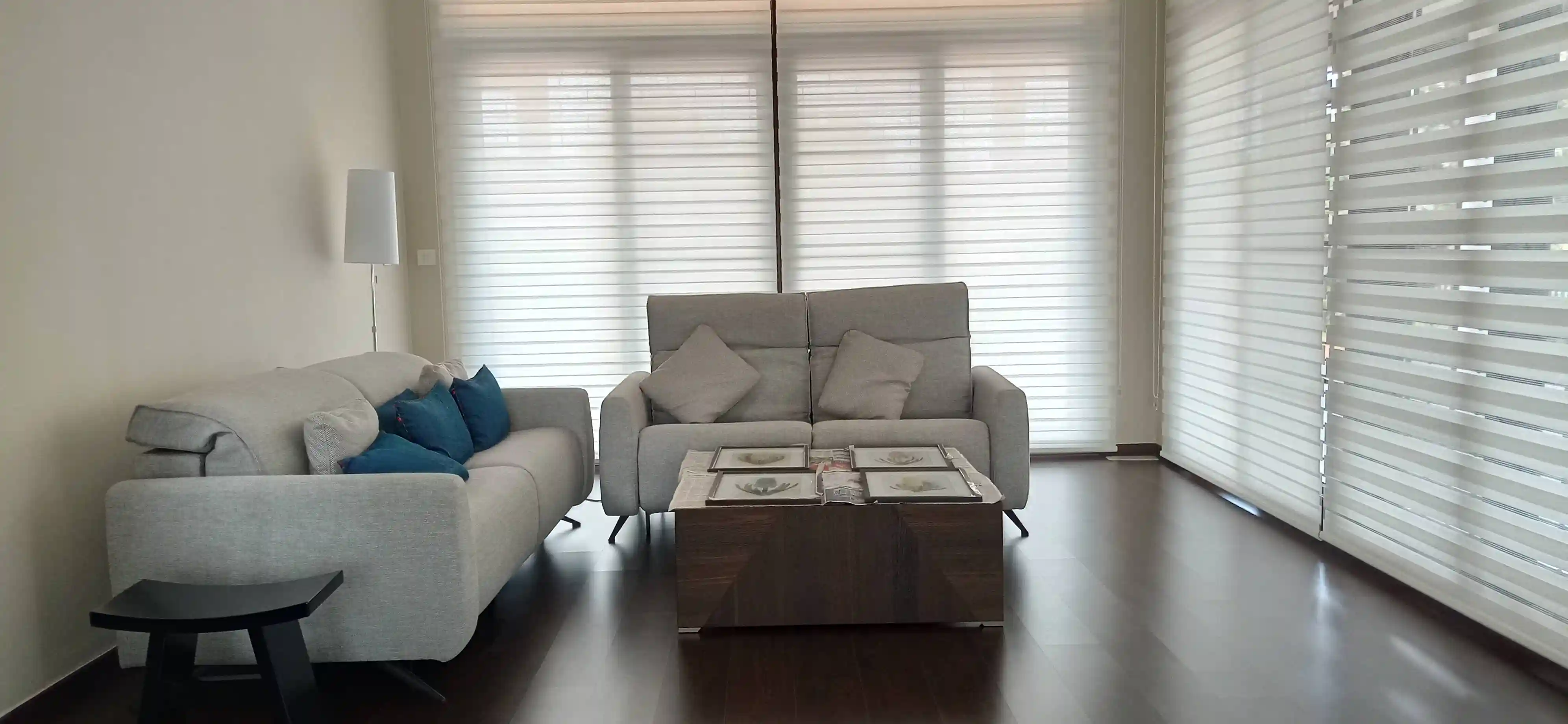 The house is built in a European style, with large aluminum and glass windows that do not offer much security. To address this issue, all windows and doors have been fitted with motorized grill shutters that automatically open at 7 AM and close at 6:30 PM every day.